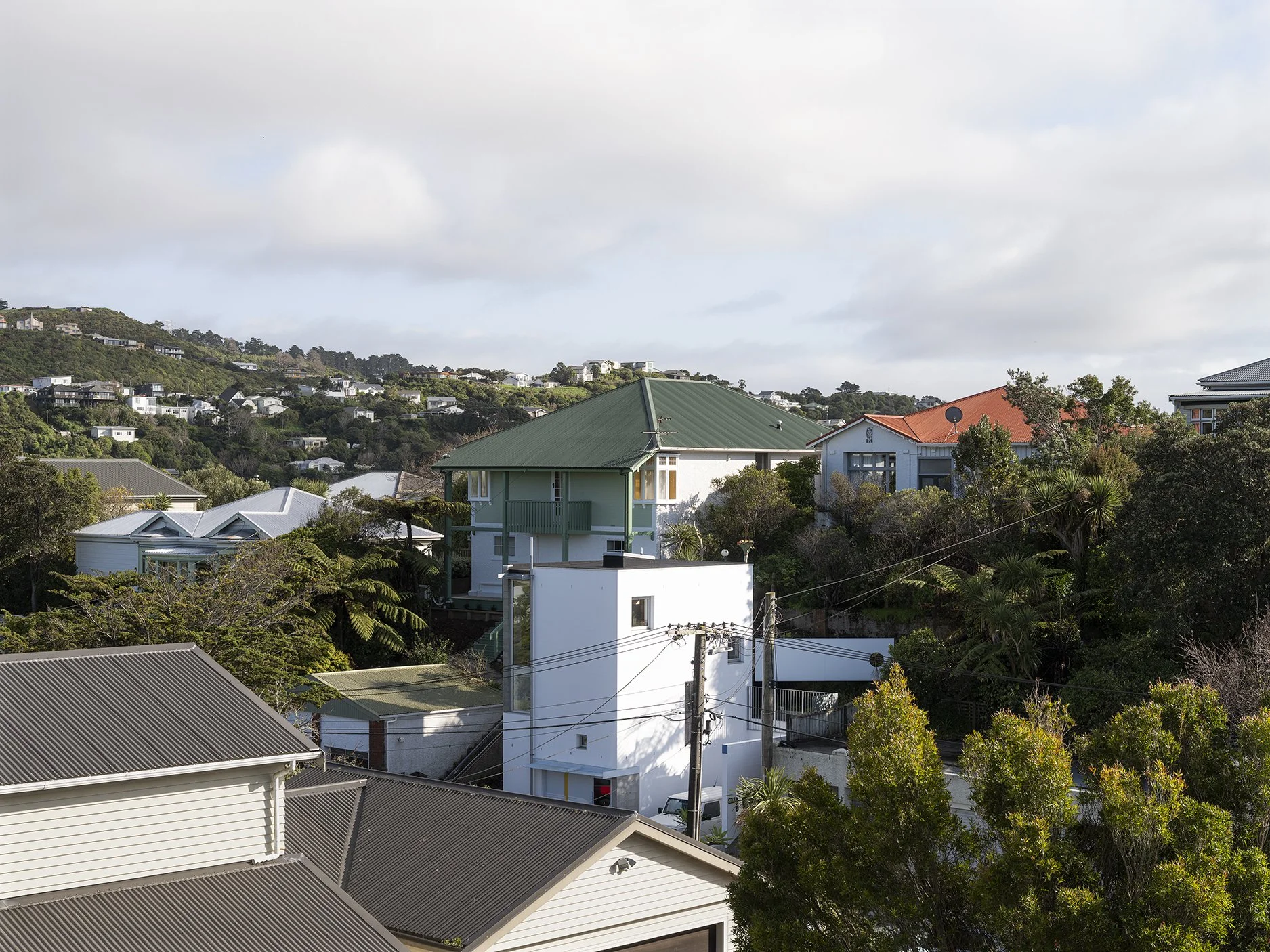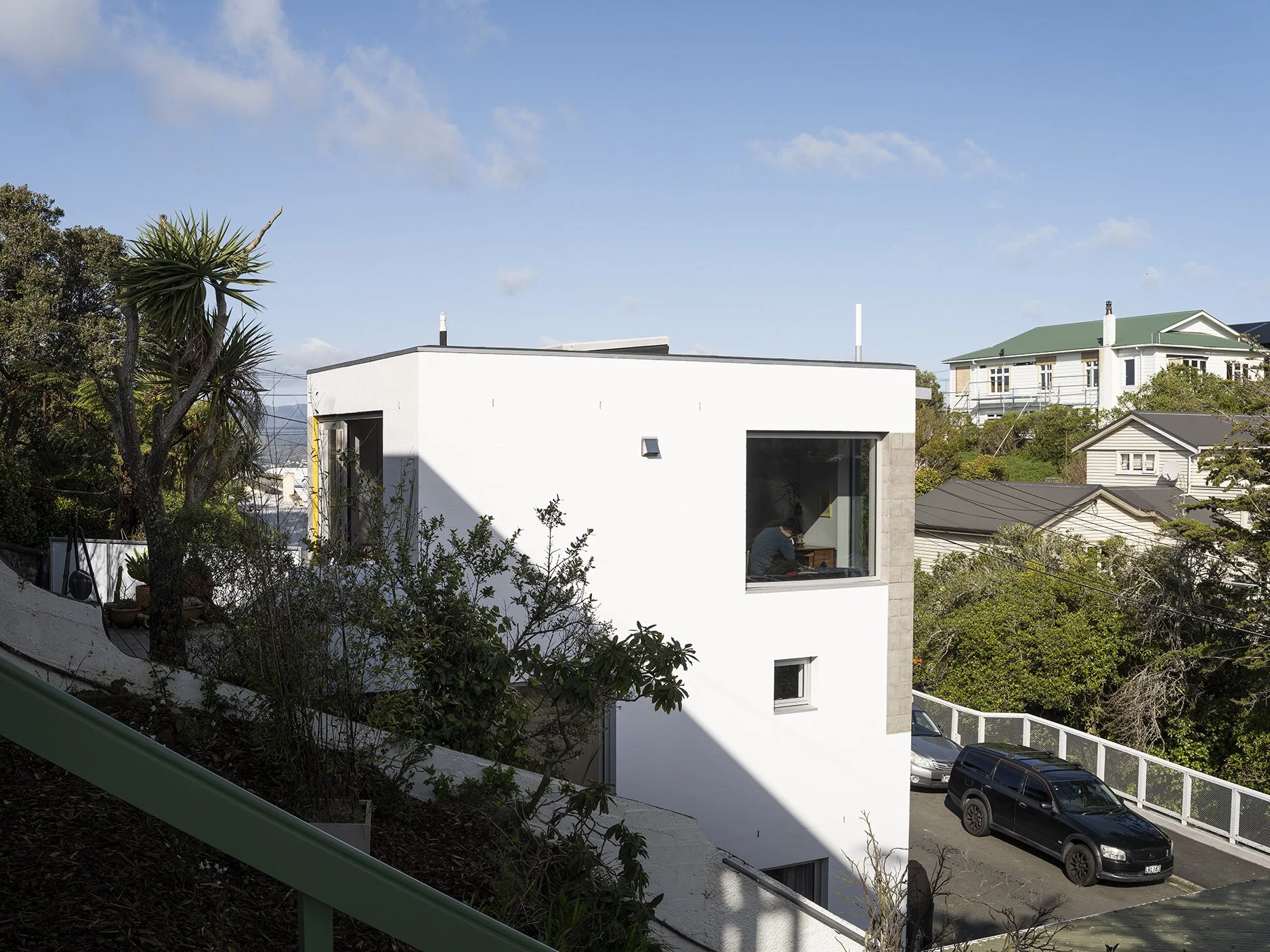 A friendly neighbour (and future client) saves a lone cabbage tree from the bulldozers. A tower of white concrete block cranes up high to grab sun and views down the valley. Think of it as a 6x4 rectangle extruded to 8 meters — replacing the hillside garage that Wellington knows too well ... it could be replicated across the city. Up top: a compact living space with a burgundy-walled skylight; a red spiral stair bringing dappled light to the lower levels; one floor down, a sleeping corner with indigo curtain and bathroom pod. And lastly at street level, the ‘garage-not-garage’, resulting from the car-focused District Plan of the day – only this time it's rethought to provide a home hair-salon with guest, yoga and piano nook.
